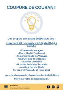 Une coupure de courant ENEDIS aura lieu mercredi 26 novembre 2025 de 8h35 à 11h55 :