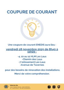 Une coupure de courant ENEDIS aura lieu vendredi 28 novembre 2025 de 8h40 à 11h20 :