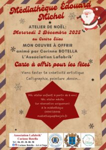 La Médiathèque Edouard Michel vous invite à son atelier de Noël « Mon œuvre à offrir » animé par Corinne Botella de l’association Lafabrik’. 14h00 atelier enfant (à partir de 6 ans) et 16h00 atelier adulte. Sur réservation uniquement à la Médiathèque 04 94 72 84 46